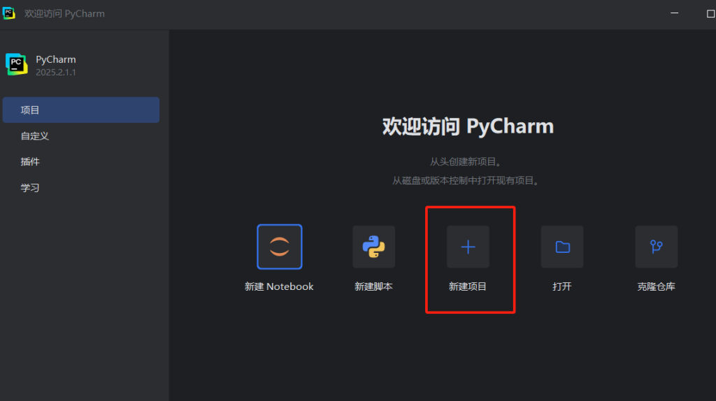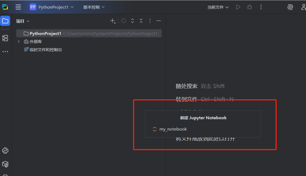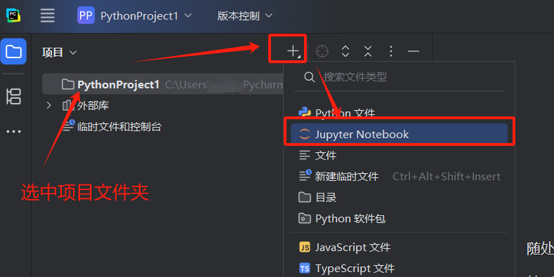 选择完成后,点击创建,即可创建一个新项目。在PyCharm左侧的项目界面中,选中项目文件夹,点击加号,新建一个Jupyter Notebook: