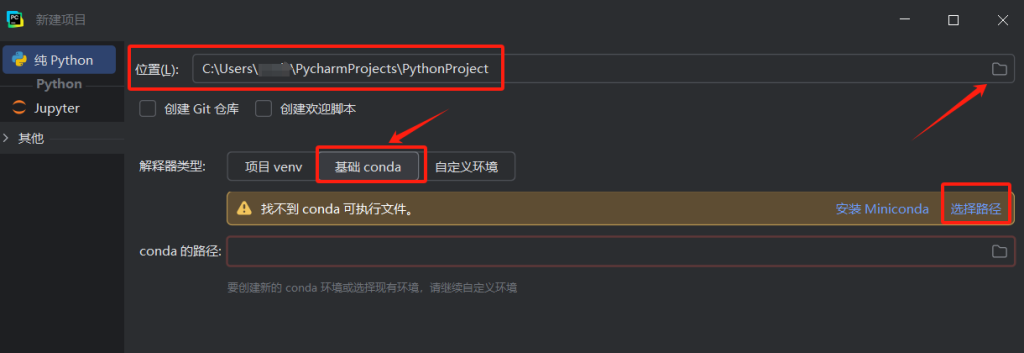 在新建项目页面中,选择任意一个文件夹当做当前工作文件夹,后续文件将保存在这个文件夹中,解释器类型选基础conda(PyCharm会自动寻找Anaconda的安装路径下的conda可执行文件,如果向下图一样提示“找不到conda可执行文件”,则需要手动选择)。