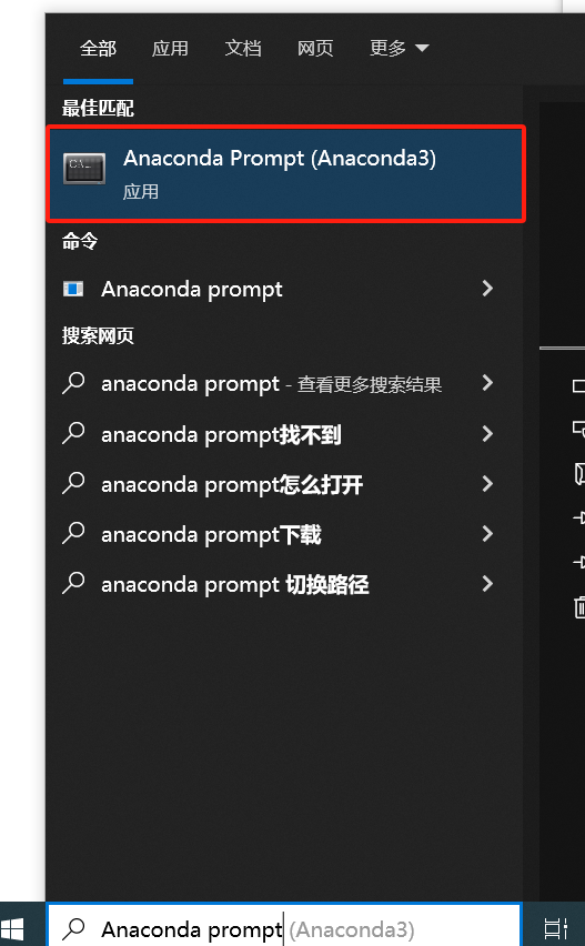 首先,在系统开始菜单搜索“Anaconda Prompt”: