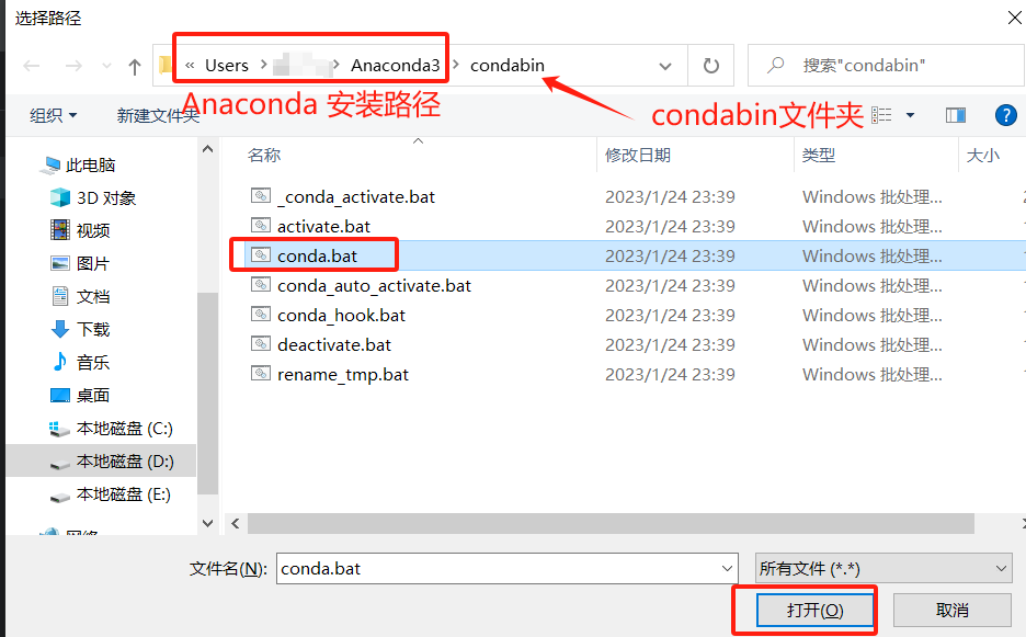 这里,我们需要选择Anaconda安装目录中,condabin文件夹下的conda.bat文件: