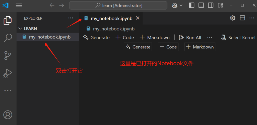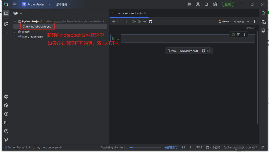 新建的notebook文件会在右侧打开(如果没打开的话,左侧双击该文件打开它):