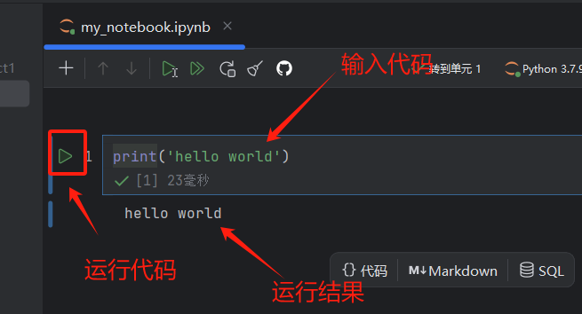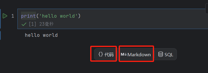 点击这里的“代码”或者“Markdown”按钮,可以在下方新建代码块或Markdown块: