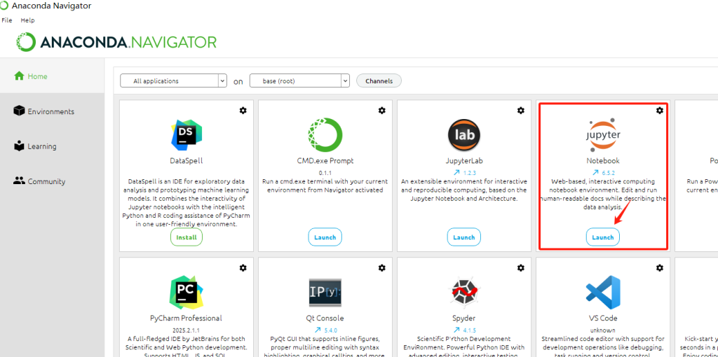 Anaconda会为我们提供Python和一个名为base的环境(包含大量科学计算和数据分析常用的包,如 NumPy、Pandas、Matplotlib 等,开箱即用,不需要自己安装)。