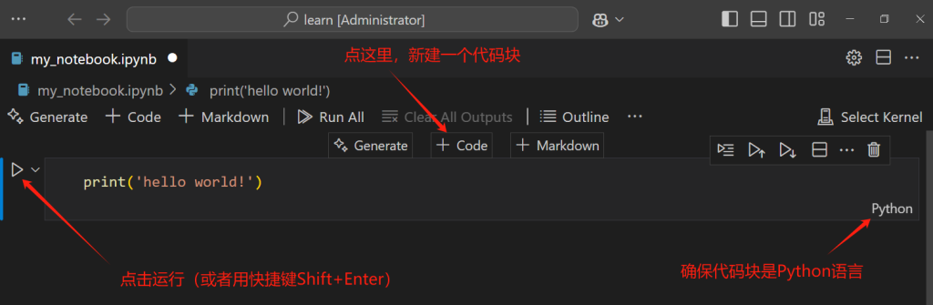 双击这个文件打开它,即可使用Jupyter Notebook,可以新建一个代码块,输入代码运行试一试。