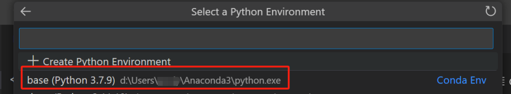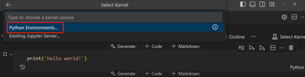 初次运行Notebook中的代码块,会弹出选择内核的界面。点击Python Environments,选择你期望的Python环境。如果你下载了Anaconda,那么可以使用Anaconda提供的base环境: